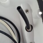 The data cable run was the second task to be done. This involved cutting another hole into the pedestal guard as there was no way I could fit the data cable down the hold that I had used for the NMEA2K, power and radio microphone cable from my previous work. I needed to carefully drill the hole since that side of the pedestal had the cables for the older Raymarine Seatalk connections for my other instruments. After I drilled the hole I then used a Dremel to round and smooth the hole and enlarge it sufficiently such that I could run the data cable. For protection I inserted a piece of split loom cable cover into the hole that the data cable would be run down. Then around this for protecting against water intrusion I placed bits of butyl tape pressed down around it.