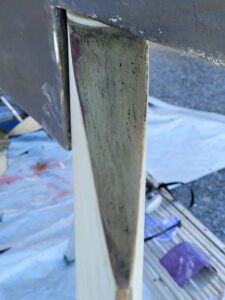 Last year when I started the sanding the hull (preparation work for changing the bottom pain type) I found that I had some cracks in the top of the rudder. At first I thought it was just a small crack but then when cleared some of the sanding dust off I realized it was cracked on both the front and rear along the top and the vertical piece up the side of the rudder post.